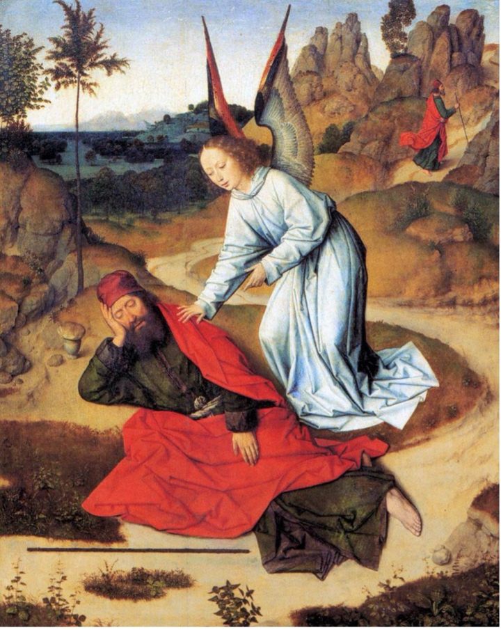 Je zou haast denken dat Elia daar, uitgeput onder een struik, gezien is door een mens. Een andere reiziger die voorbijtrok. Een nomade die brood en water met hem deelt en een bemoedigend woord spreekt. Sta op, eet wat. Hele menselijke woorden. En dat geeft hem de kracht om door te gaan.